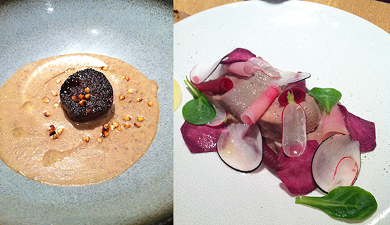 A gauche : mise en bouche autour du boudin noir. A droite : langue de veau, racines, vinaigrette tiède