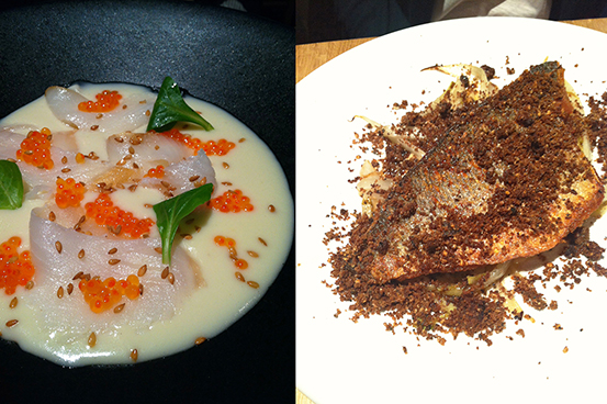 A gauche : crémeux d’héliantis, flétan fumé, lin soufflé. A droite : daurade royale cuite sur la peau, endives sautées à cru, terre de Provence